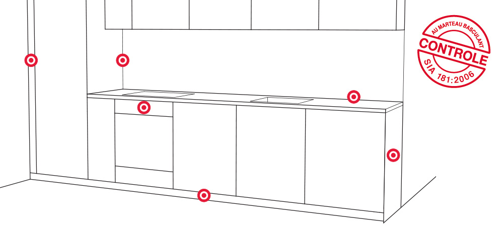Les éléments de cuisine sont montés avec des composants d’isolation phonique Stauffer séparément du corps du bâtiment. Les liaisons non isolées entre les éléments de cuisine et le corps du bâtiment forment des ponts solidiens et doivent être impérativement évitées.