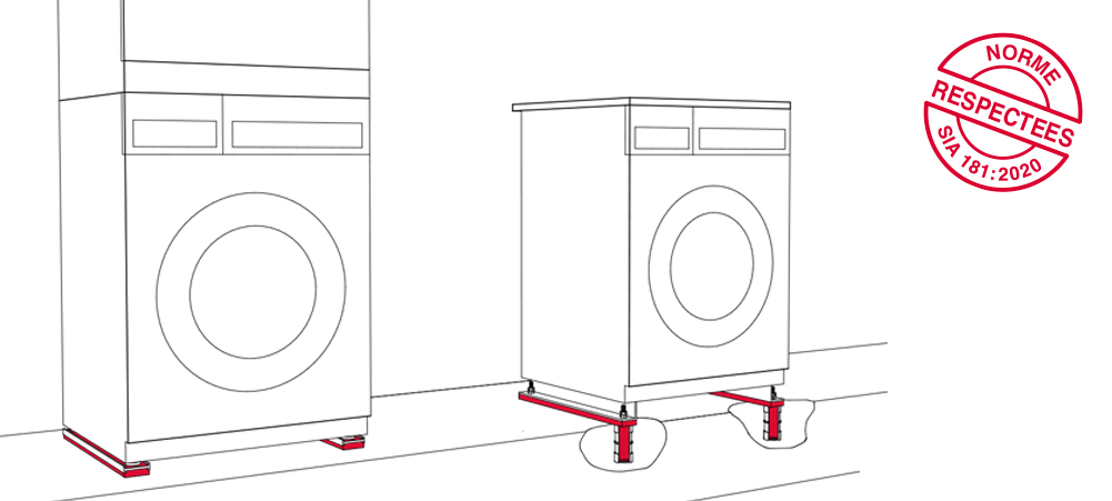 Pendant le lavage, les sets d’isolation phonique offrent une isolation contre les bruits solidiens et une protection anti-glissement optimales pour les machines à laver et les tours de lavage. Des sets d'isolation phonique adaptés sont disponibles pour les machines à laver sans fixation ou vissées. Ils peuvent également être installés a posteriori, simplement et à moindre coût sur les machines à laver déjà en place.