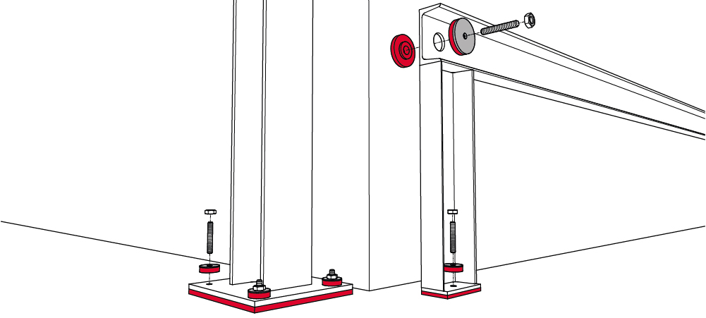 Les constructions sont fixées contre le corps du bâtiment avec des rondelles SILENZIO. Pour absorber les charges de compression, les rondelles SILENZIO peuvent être utilisées par paires ou, pour des charges plus élevées, combinées à des plaques de nos gammes de supports MAXUM et d’appuis compacts MAXUM.